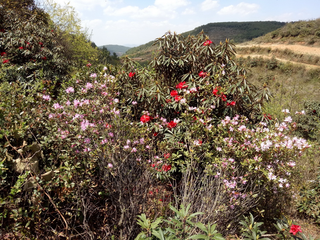 一个坑,两个坑……触目惊心; 大红花,开得美,招来恶运。 三四月,红艳艳,惹动贪人; 刀斧砍,钉锄挖,刨土断根。 虬枝折,五花绑,势难抗争; 化学肥,雕花罐,移栽私庭。 非是我,不愿意,装点美景; 奈何是,红尘中,臭气难闻。 活上个,二三载,人正高兴, 又谁知,根已萎,吾不恋生。 枝渐槁,叶渐落,回归本命, 愿人们,收魔手,莫向山林! (宣威山上多大红花,即列为市花之杜鹃也。本属保护植物,却常有人挖回培植,总难成功。故作此诗,以为大红花呐喊一回也!)