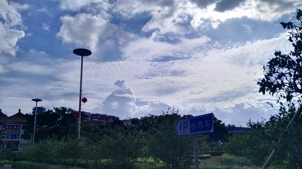 相传吴刚因不堪受辱而杀死了炎帝之孙伯陵,被炎帝惩罚到月宫砍伐桂树,而桂树永远也砍不倒,吴刚还是不停地挥动斧头,一斧一斧地砍下去,桂树又一点一点长回来,日复一日,单调又枯燥。有一天,他累了,往下界了一眼…… 中秋前夕,本人在广东江门市东湖广场无意中摄得一景,图中白云飞舞,其中有一片云类似一古人端坐,看似月宫伐桂的吴刚,于是,笔者干脆把他视为吴刚,并得诗一首,预祝文友和网友们中秋快乐!——题记