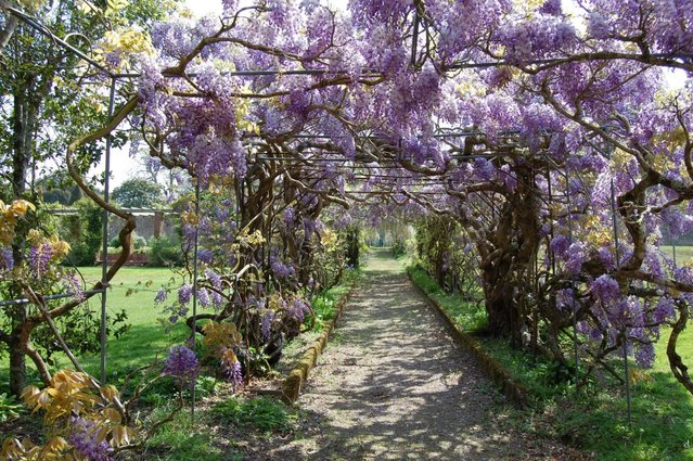 “紫藤花下渐黄昏”,是白居易《三月三十日题慈恩寺》诗中的句子。紫藤花开,已近暮春时节,黄昏时的阳光不太浓烈,曲径回廊的紫藤架上,已是“藤花紫蒙茸,藤叶青扶疏”了,青紫之间,煞是可爱。彼时,经历繁华的桃红李白,已在春光中无可奈何花落去,有了紫藤,将要流逝的春天才不至于仓皇落寞收场。 “藤花无次第,万朵一时开。”春阳烁金,纷繁的紫藤花披垂如瀑,如美人迟暮,顾不得次第花开的矜持,于是决绝地一古脑儿全开了,开得浓妆艳抹,开得无收无束,不管不顾,一串一串粉紫深紫,一片蒸腾的紫色云霞,灿烂似锦,花间溢出的淡淡清香,也仿佛流淌着紫色。 紫藤的性格是柔的,像女人,有了坚实的依靠,就会攀援向上生长,生长出生命的高度。岑参说:“竹径厚苍苔,松门盘紫藤。”紫藤缠结生长至高处,垂下花穗,扬起枝叶,看尘世间的人和事,欢和喜,就充实,就笃定。人生有了高度,就有了昂首抬头看天、敛眉低头观景的从容,才能在人世间展示女人的百般妩媚千般好。 紫藤也是韧的,也像女人,攀着一棵树,就安安静静地在悠悠岁月中慢慢生长,是也无风雨也无晴的安静美好。我曾见过藤缠树,生在乡野,是一树百年的老藤缠在一株更老的树上,穿越百年的厮守,竟是这样的安静,这样的生生不息。山脚下,半月形的池塘约亩许,它们立在水塘边,老树挺拔,高入云天,紫藤缠树,横逸斜伸,春来树冠高擎绿伞,如伟男子,紫藤花开烂漫,依在树腰处,如被春风吹得飘飞如舞的紫色裙裾,像小女人。远远望去,一树风景,半在眼前,半在塘里,如揽镜自照,在山野的春天里,兀自开放出一片岁月的安宁。如李白的诗:“紫藤挂云木,花蔓宜阳春。密叶隐歌鸟,香风留美人。”就这样,它们缠出了一片风景,也缠出一世的绰约风情。 紫藤也是有所寄托的。宗璞笔下的紫藤花是度过不幸的生命长河中流动着的花的灿烂,是看到紫藤重又花开的欣悦,也是经历不幸后,那份重生的喜悦。那份喜悦如紫藤花的活泼热闹,也如孩童,只是又多了一份孩童没有的深沉。“‘我在开花!’它们在笑。‘我在开花!’它们嚷嚷。”一朵花开,也如一张人的灿烂笑脸,好像每一个赏花的人也成了一朵盛开着的紫藤,饱满张扬,喜形于色,溢出花香。 除了可赏之外,紫藤花是可食的。新摘下来的紫藤花瓣,颜色可喜,清香可人,洗净焯水凉拌,裹面油炸,或制成藤萝饼都是不错的选择。梁实秋居北京时,家里就有一株紫藤,“花开累累,满树满枝,乃摘少许洗净,送交饽饽铺代制藤萝饼,鲜花新制,味自不同。”代制的藤萝饼是酥皮的,虽省事,但与家庭自制的又有所区别。王世襄家的藤萝饼是自己动手制作的,用的是紫藤花蕾,做得也更精致,作面包馅用,实际是藤萝包了。摘下紫藤含苞的花蕾,去蕊去蒂,将花瓣洗净,拌糖腌渍,花瓣渍得蔫了,加去脂皮的猪脂丁拌成馅儿,取面包成圆饼状,蒸熟,清香暄软。 读书的时候,教我盆景的洪吉兆老师家也做藤萝饼,那是安徽歙县山里人家的做法。将紫藤花洗净,和在准备好的米粉里拌了,做成粑粑状,放油锅里煎好,双面金黄,煎得暗黄的紫藤花,焦脆喷香。 |