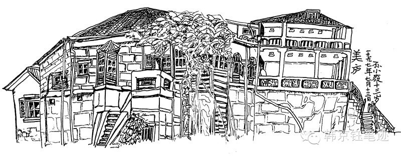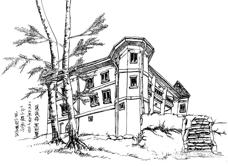 我最喜欢的别墅是“美庐”。 当我在清晨的清风清露中面对它们的时候,心中就立刻升涌起深深的激动。傻傻的陪着女儿画画,画了十来年,唯此刻,自己萌发了一种强烈的绘画冲动,仿佛突然间在对象和画面之间找到了一种感应。也许我根本就不懂画画的技巧,却感觉我的每一幅写生都是在心跳加快和手指的微微颤抖中完成的。画美庐时正下着雨,是戴着斗笠画的。我实在不能想象我当时的姿势。身后那棵高大的,象一个男人和一个女人的幽灵般的连体树的枝叶将留不住的水珠滴落下来,在我的斗笠上敲打着,哒哒地响。……